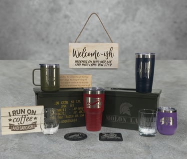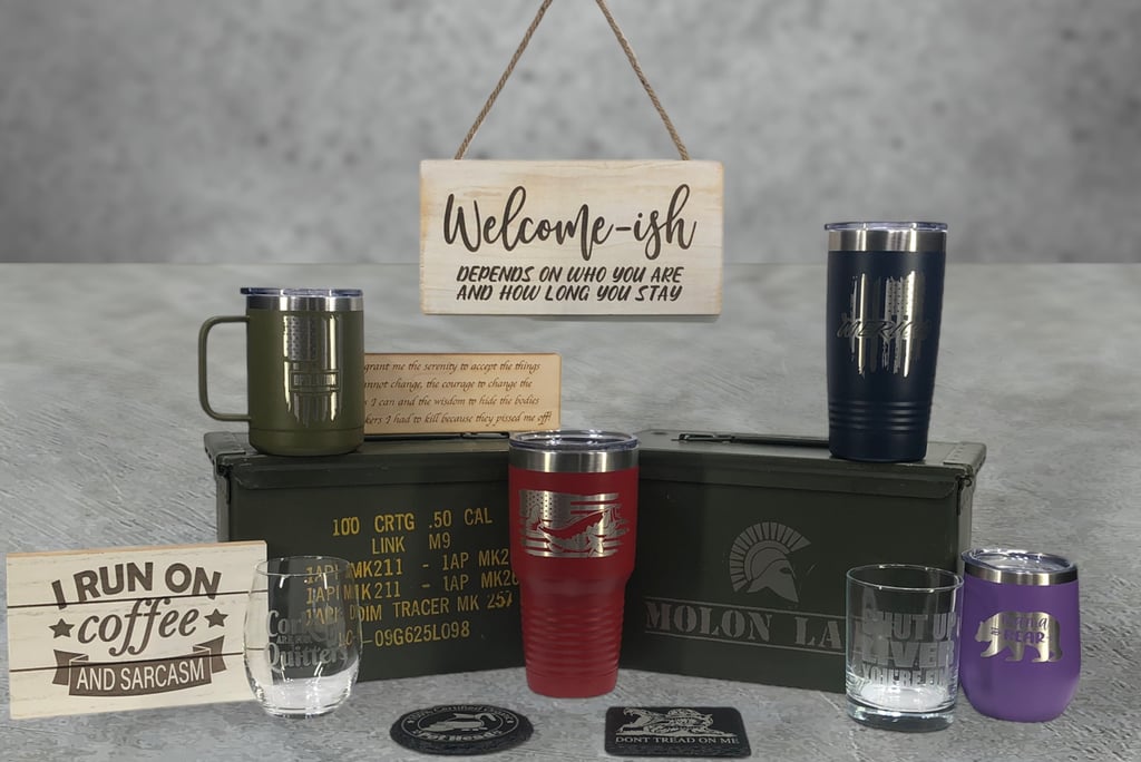 We'll etch your company name, company logo, favorite saying, good joke, bad joke, patriotic image, funny image, memorial image, silly image, bridesmaid gift, groomsman gift, or damn near anything you can imagine on a tumbler, glass, wood, ammo can or almost anything else.